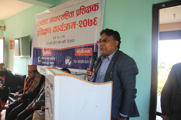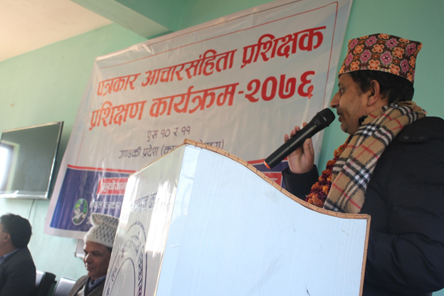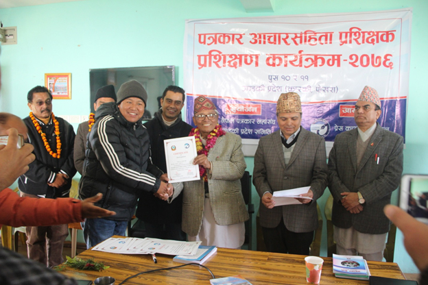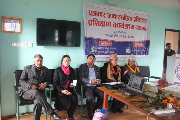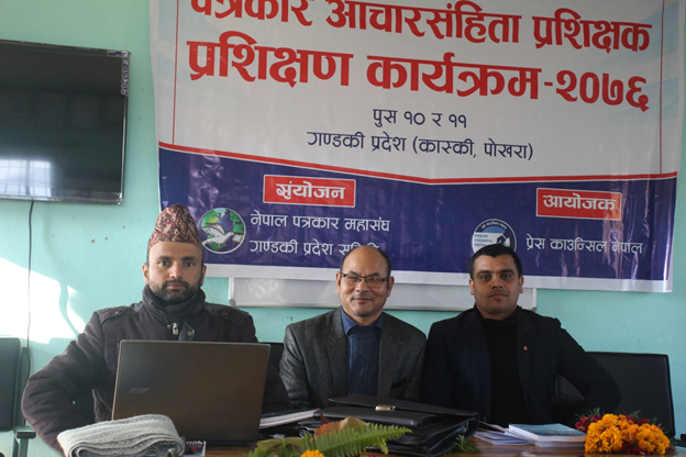 गण्डकी प्रदेशस्तरीय पत्रकार आचारसंहिता प्रशिक्षक / प्रशिक्षण कार्यक्रम कास्की जिल्लाको पोखरामा सम्पन्न भएको छ । यही पुस १० र ११ गते सम्पन्न उक्त कार्यक्रममा पत्रकारलाई पत्रकार आचारसंहिता, भाषाको प्रयोग, व्याकरणीय शुद्वाशुद्वी र यसको कार्यान्वयन सम्बन्धमा प्रशिक्षण दिइएको थियो ।
